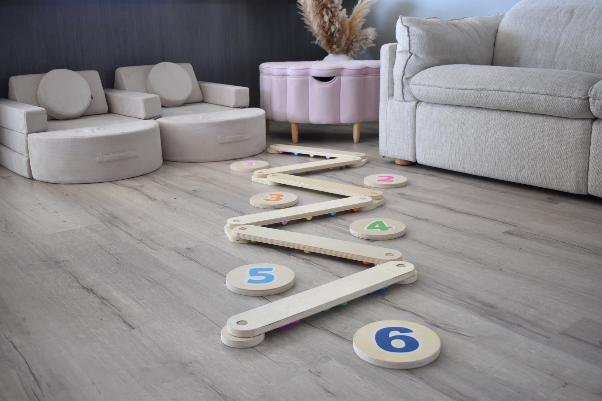 Unlock creativity using both beams and the stepping stones by making various obstacle courses, starting simple with the flat side and as your little ones confidence grows increase the difficulty by turning to the other side adding in new obstacles, unlocking countless different obstacles to keep the young minds stimulated.